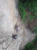When we had all reached the top of the chimney and were standing beneath a 40-metre vertical rock face cut by a wide crack, the rain had set in fully. An approaching storm could be felt. At this point our guide decided that continuing the ascent had become extremely dangerous and directed us back the way we had come. To minimise the risk of accidents, he lowered us all down on a rope.